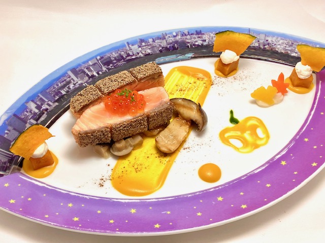 キノコとカボチャをエスカベッシュ(南蛮漬け)にしたものと、大黒しめじのグリエとイクラを添えて、カボチャの深い甘みのあるソースとご一緒に。
