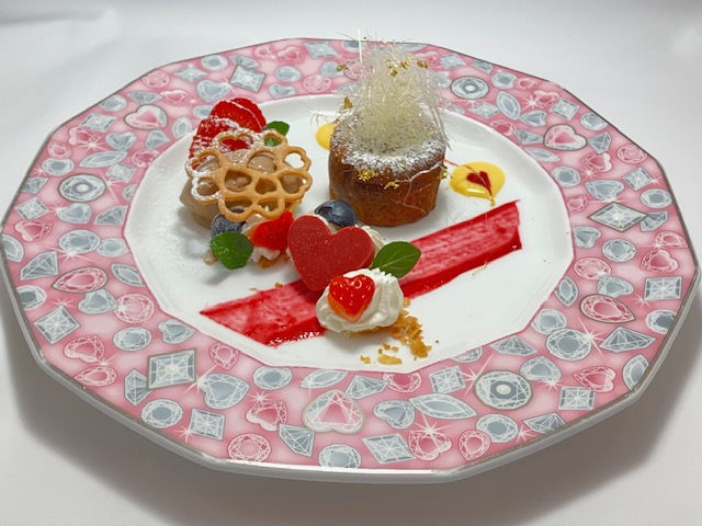 ハート形のストロベリーチョコやふわふわの飴細工を添えて、宮崎特産よかもよか卵を使った濃厚アングレーズソースとご一緒に。皆様のご来店を心よりお待ちしております。